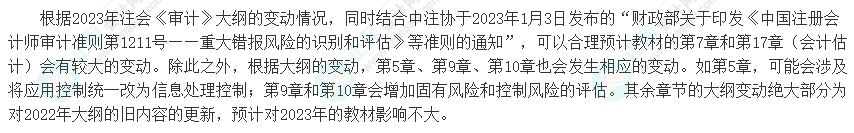 2023年注册会计师考试大纲已公布,(点击查看大纲>)!2023年注会《审计》与2022年考试大纲变化大吗?别急!正保会计网校针对新旧注会考试大纲的变化进行了对比分析,让你轻松看懂变化!