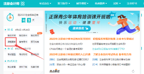 首先打开正保会计网校官网(//www.fawtography.com/)首页,选择“注册会计师”栏目--左侧倒计时下方位置--课程更新,点击进入可以看到注册会计师各班次课程,点击您所购买的班次名称,即可看到课程更新进度和下次更新时间哦。