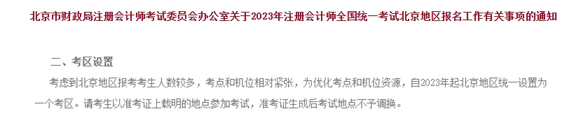 自2023年起北京地区统一设置为一个考区。请考生以准考证上载明的地点参加考试,准考证生成后考试地点不予调换。