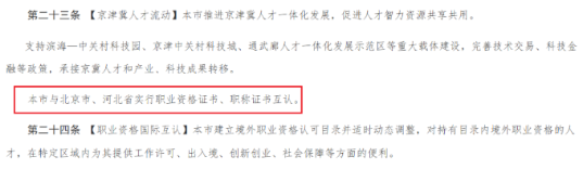 天津发布《天津市人才发展促进条例(草案征求意见稿)》,其中第23条表明:本市与北京市、河北省实行职业资格证书、职称证书互认。