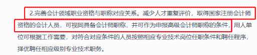 此前,北京市人力资源和社会保障局发布《北京市深化会计人员职称制度改革实施办法》,其中提到:取得国家注册会计师的会计人员,可视同具备会计师职称,并可作为申报高级会计职称的条件。