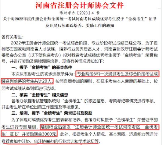 近日,河南注册会计师协会发布了“关于对2022年度注册会计师全国统一考试河南考区成绩优秀考生授予“金榜考生”证书及开展后续跟踪培养、奖励工作的通知”。