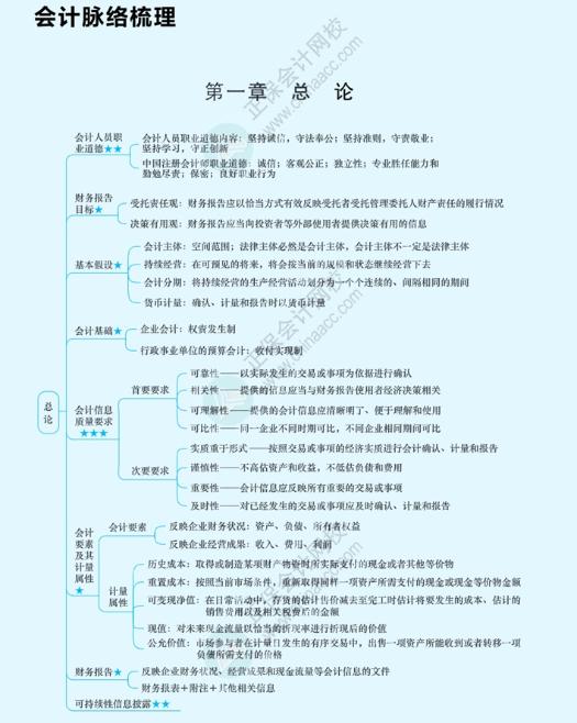 无论是自己制作还是现有的思维导图,同学们都可以按照章节标题逐步回忆教材内容,例如:下图是《会计》第一章的思维导图,先捂住右边的具体内容,看左方带星号的标题,回忆基本假设有哪些方面。标注星号(或自己喜欢的符号)以区分重难点,在复习的时候针对性、侧重复习。