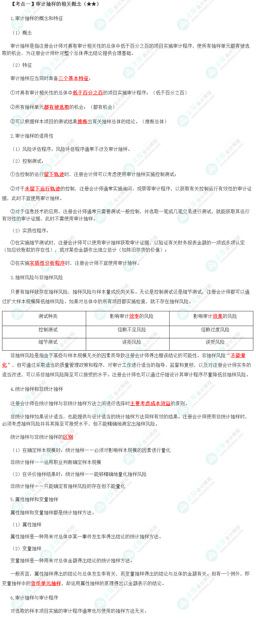 高频考点 | 审计抽样的相关概念、影响样本规模的因素、审计抽样在控制测试中的应用、审计抽样在细节测试中的应用 |