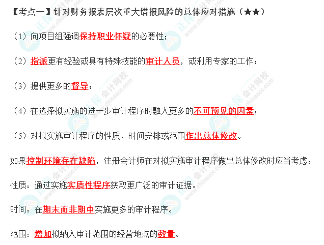 高频考点 | 针对财务报表层次重大错报风险的总体应对措施、针对认定层次重大错报风险的进一步审计程序、控制测试中如何考虑以前审计获取的审计证据、实质性程序 |