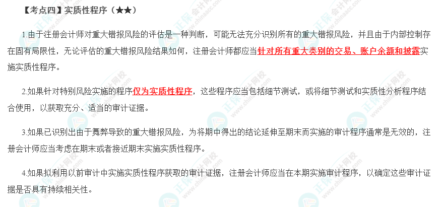 高频考点 | 针对财务报表层次重大错报风险的总体应对措施、针对认定层次重大错报风险的进一步审计程序、控制测试中如何考虑以前审计获取的审计证据、实质性程序 |