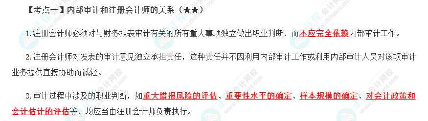 高频考点 | 内部审计和注册会计师的关系、确定是否利用、在哪些领域利用以及在多大程度上利用内审工作/直接协助、利用专家的工作 |