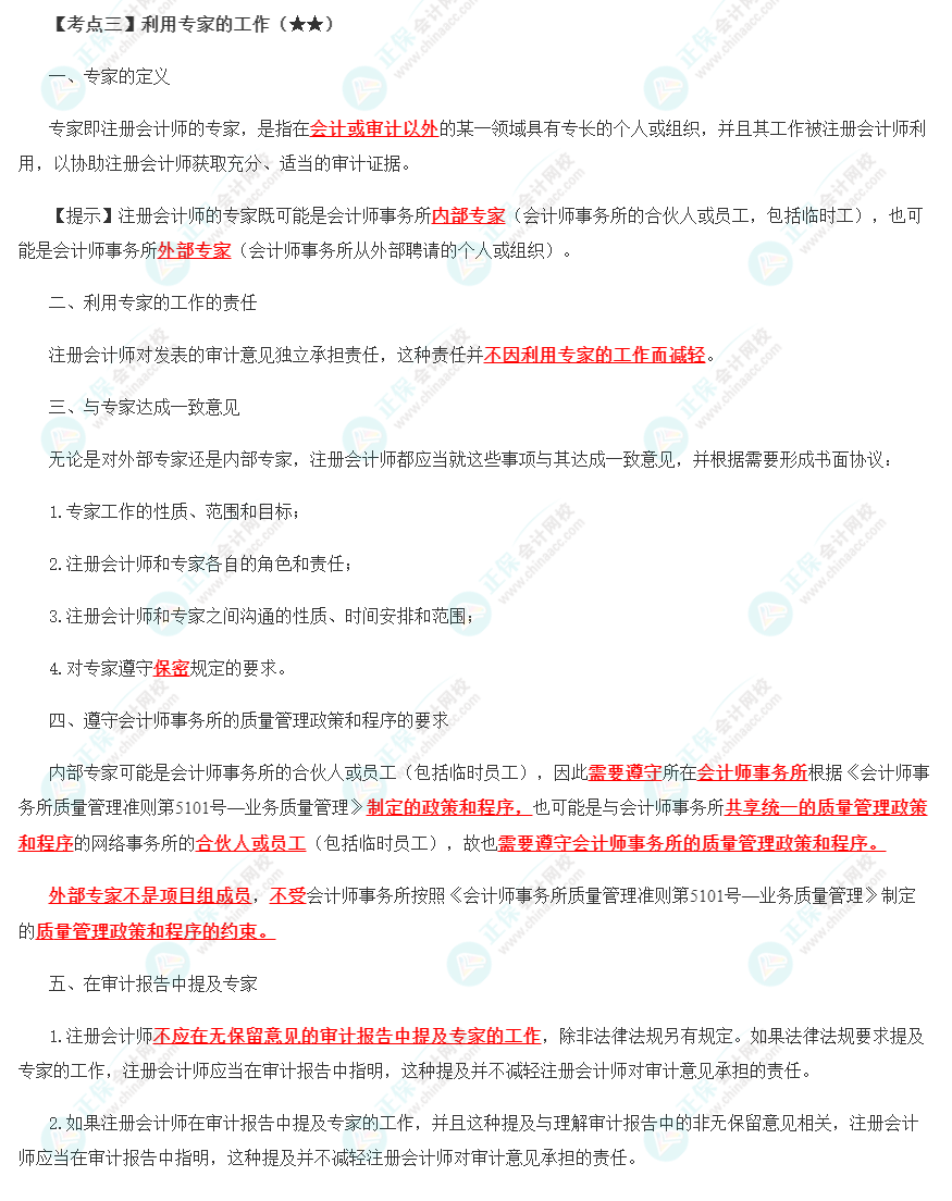 内部审计和注册会计师的关系、确定是否利用、在哪些领域利用以及在多大程度上利用内审工作/直接协助、利用专家的工作 |