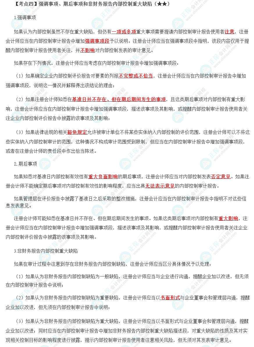 内部控制审计与财务报表审计的异同点、自上而下的方法、内部控制缺陷评价和整改、强调事项、期后事项和非财务报告内部控制重大缺陷