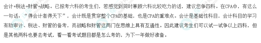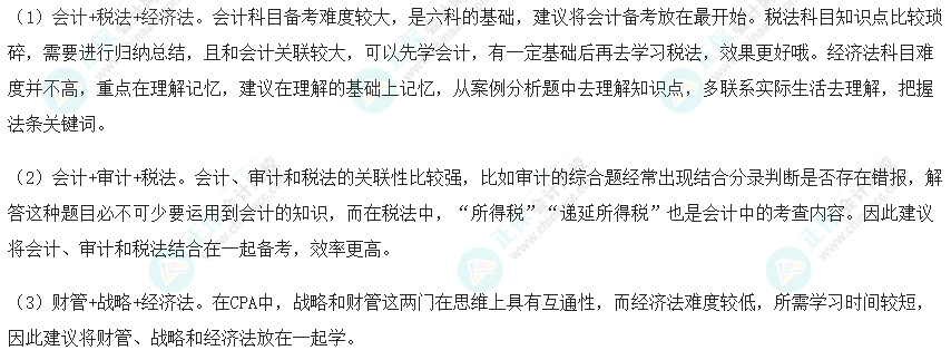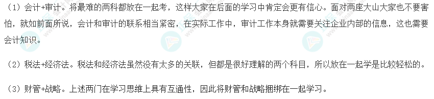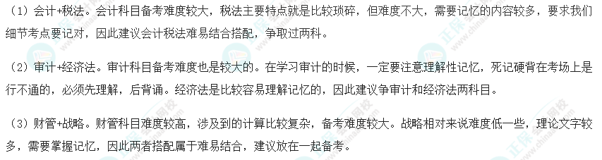 注册会计师考试科目搭配是讲究方法的,大家在搭配的时候一定要注意科目之间的关联性,选择关联度高的科目搭配在一起进行备考,这样才能够起到相互促进的作用。当然我们在搭配的时候也要注意学科的难度,其中会计、审计、财管这三科难度相对较高;而税法、经济法、公司战略与风险管理这三科考试难度相对来说较低一些,在选择科目的时候同学们一定要注意难易结合,以此来均衡我们的备考难度。