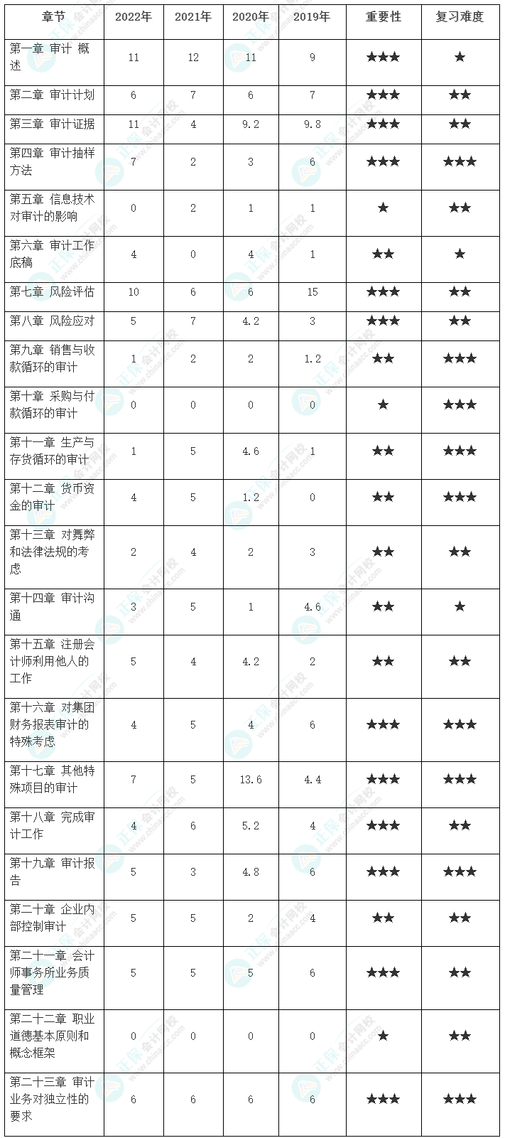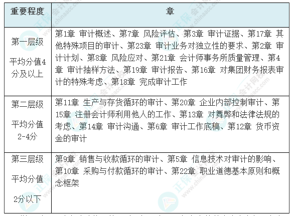 《审计》教材共有23章内容,根据历年题目各章分值分布情况统计,可以将教材划分为三个层级: