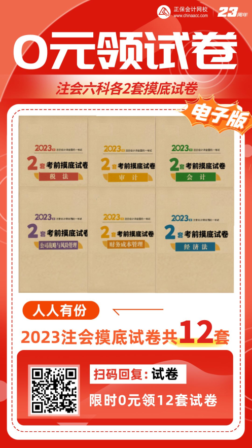 距离2023年注会考试越来越近,为助力考生备考,网校教研老师精心编写CPA六科各2套考前摸底电子版试卷,限时0元领取!与正式考试题型、题量一致。考前摸底,查漏补缺,助力冲关有了它,让你离60+更进一步!