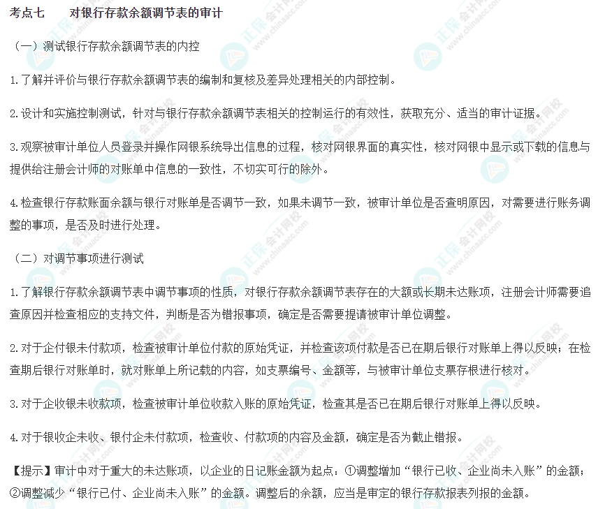 2023注会《综合阶段》必背考点七:对银行存款余额调节表的审计