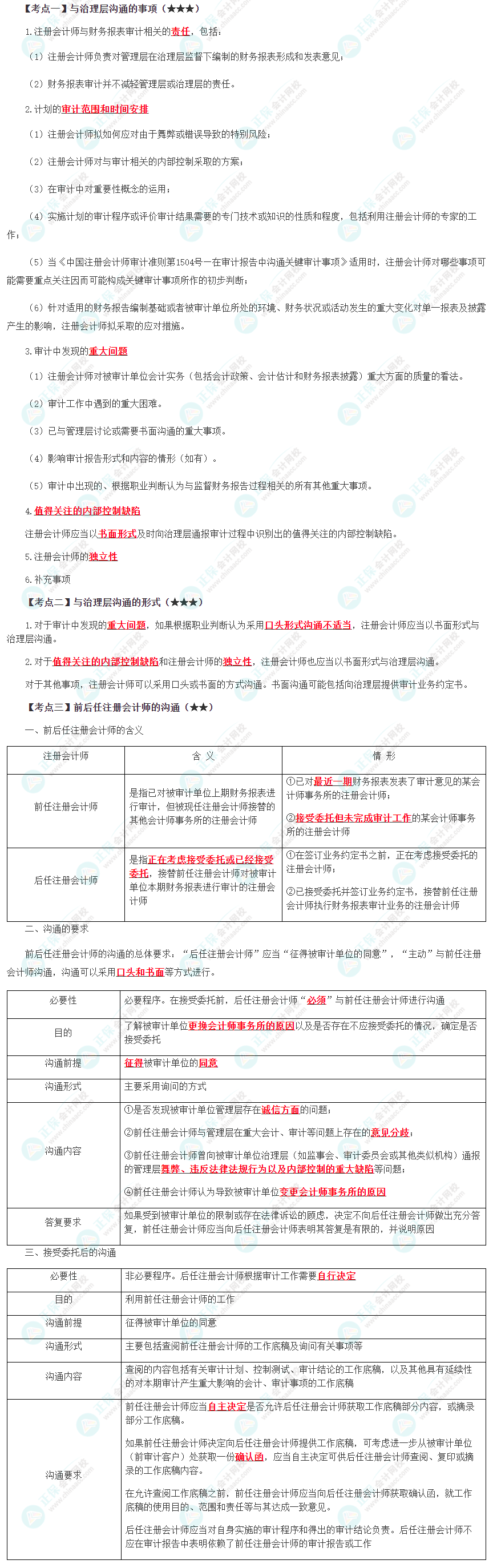 预习考点 | 与治理层沟通的事项、与治理层沟通的形式、前后任注册会计师的沟通 |