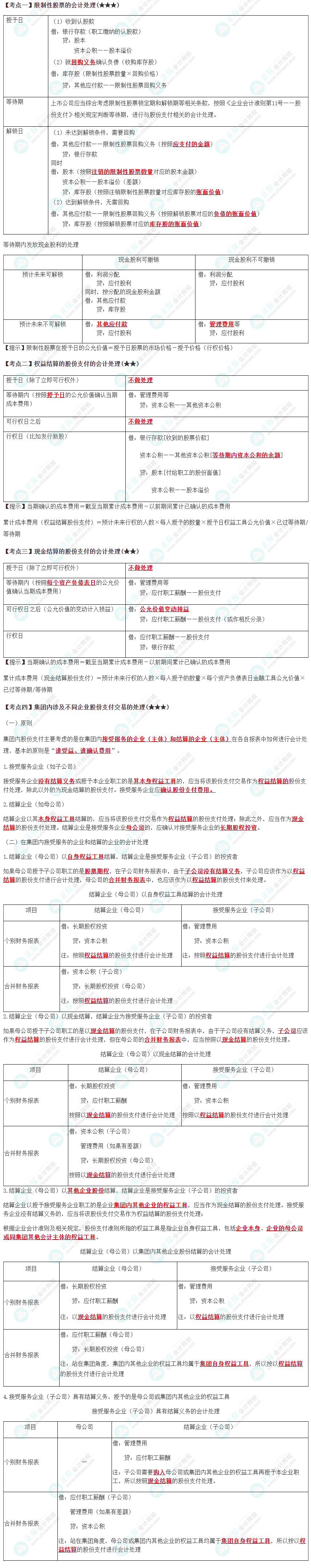 预习考点 | 限制性股票的会计处理、权益结算的股份支付的会计处理、现金结算的股份支付的会计处理、集团内涉及不同企业股份支付交易的处理 |