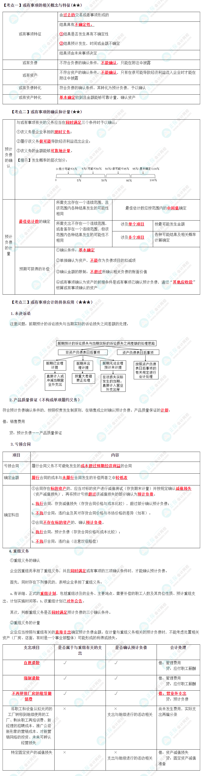 预习考点 | 或有事项的相关概念与特征、或有事项的确认和计量、或有事项会计的具体应用(未决诉讼的核算、产品质量保证、亏损合同、重组义务) |