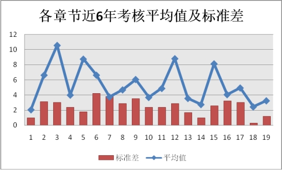 注会财管的考试虽然每章都会涉及,但各章的分值并不平均,有些章节在不同年份考核的分值相差较大,有些章节在不同年份考核的分值基本相同,根据不同章节各年的考核分值绘制近6年考试的各章考核分值的平均分与标准差的图形:
