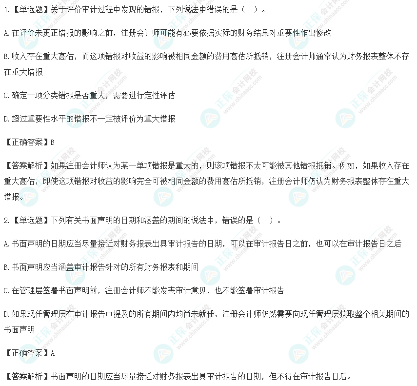2024年注会备考火热进行中,你的备考之路是否已开启?网校老师为大家整理了注会考试《审计》科目的易混易错题,预习阶段做一做,对于打好基础和了解考试很有帮助哟~快来看看吧!
