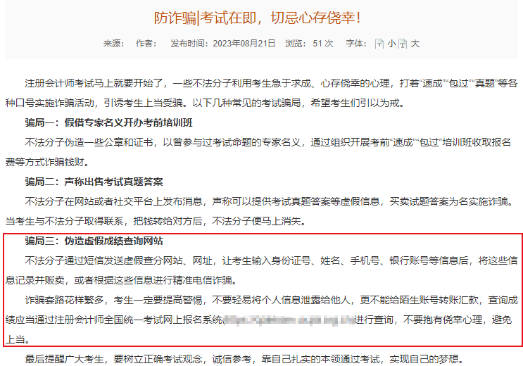 2023年注册会计师成绩查询在即,很多骗子就根据这段时间大家等成绩的焦虑心理,扩散一些不实的信息。