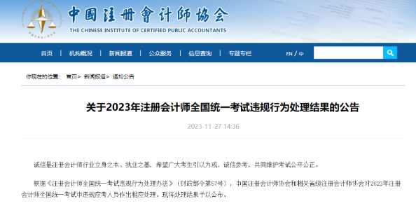 根据《注册会计师全国统一考试违规行为处理办法》(财政部令第57号),中国注册会计师协会和相关省级注册会计师协会对2023年注册会计师全国统一考试中违规应考人员作出相应处理。现将处理结果予以公布。
