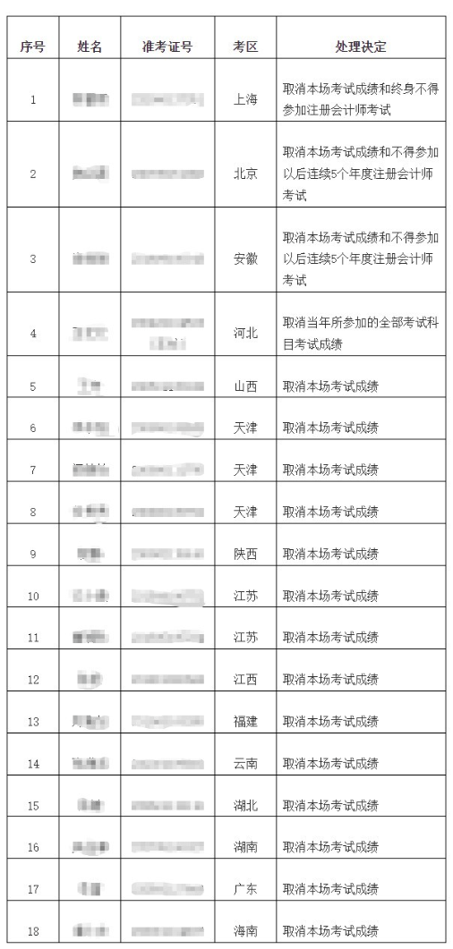 公告中表示:18名考生被取消成绩,其中1名考生被处理决定:取消本场考试成绩和终身不得参加注册会计师考试!2名考生被处理决定:取消本场考试成绩和不得参加以后连续5年度注册会计师考试;1名考生被取消当年所参加的全部考试科目成绩。