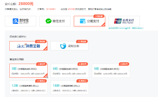 2、在支付界面选择“分期支付”→选择适合自己的分期平台进行支付。