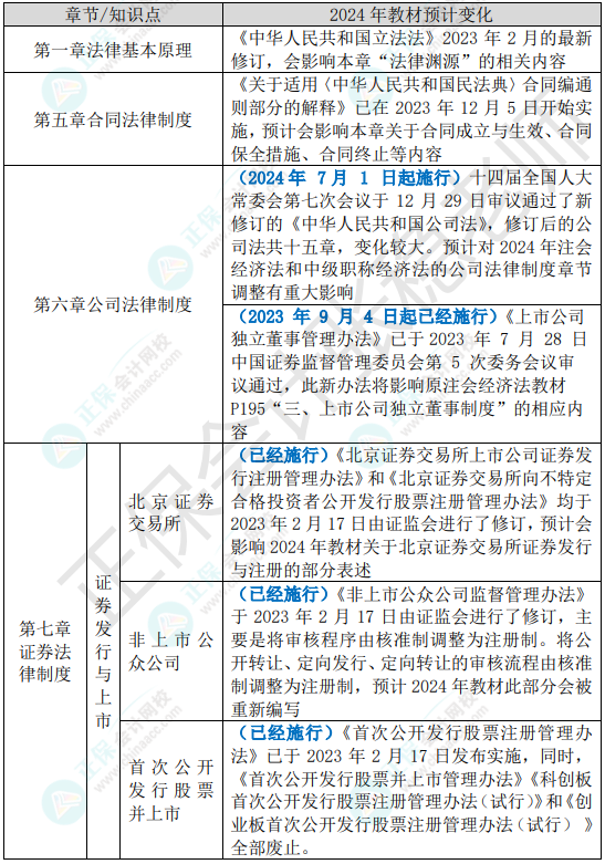 新公司法和全面注册制改革对2024年注会经济法科目影响很大,张稳老师依据目前已经施行和正在征求意见阶段的法律规范为大家整理了注会经济法考纲和教材变化,供考生朋友们目前预习阶段参考,快来看看吧!