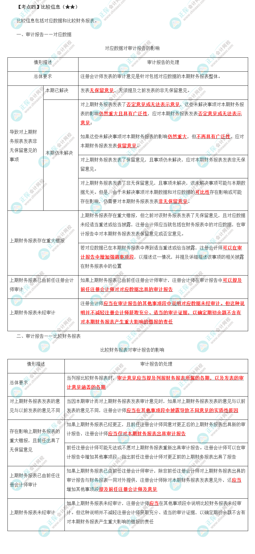 高频考点 | 在审计报告中沟通关键审计事项、确定非无保留意见的类型、强调事项段与其他事项段、比较信息、注册会计师对其他信息的责任 |
