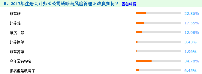 正保会计网校对《公司战略》考试难易程度做了一份问卷调查,共计有2655人参与此次调查,调查显示,22.86%的考生认为试题非常难,17.55%的考生认为试题比较难,只有12.98%的考生认为考试难度一般。对比去年的调查结果,可以看出《公司战略》考试略微上升。