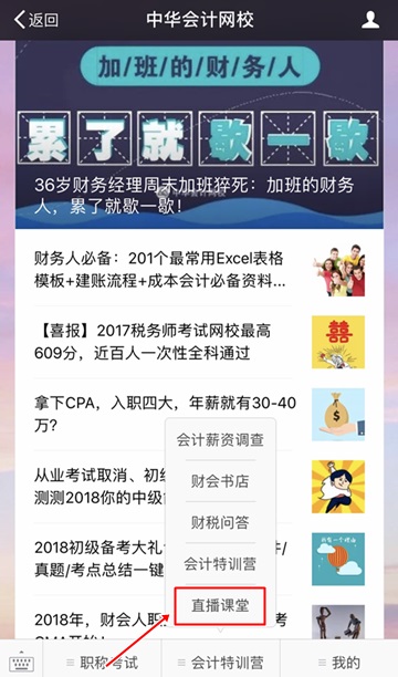 参与方式二:关注正保会计网校微信官方公众号,微信号:wx_chinaacc,点击菜单【会计特训营】【直播课堂】进入本次直播交流教室。