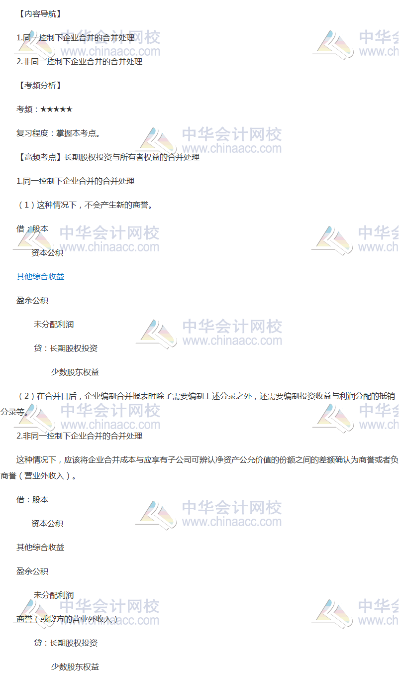 备考时间紧张,抓紧时间抓住重点备考注册会计师吧!正保会计网校教学老师为广大考生整理了高频考点,我们一起来学习2018《会计》高频考点:长期股权投资与所有者权益的合并处理。本考点属于《会计》第二十七章合并财务报表第四节长期股权投资与所有者权益的合并处理(同一控制下企业合并)和第五节长期股权投资与所有者权益的合并处理(非同一控制下企业合并)的内容。