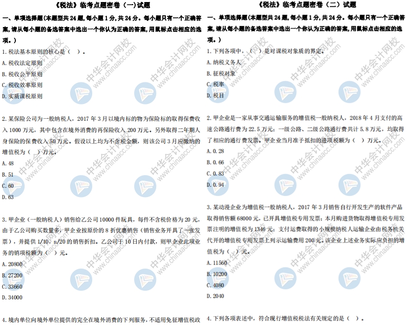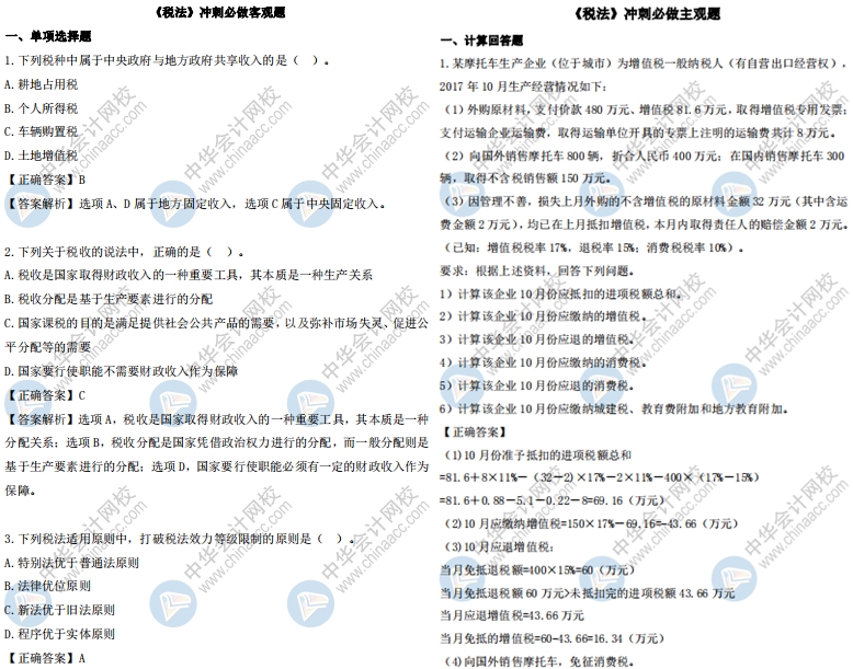 2018年注册会计师考试时间为10月13日-10月14日,距离注册会计师考试还有不到20天的时间,目前阶段大家都在不停地刷题寻找自己的薄弱环节。可是有些题目都是相同的知识点已经很熟悉了,再一遍遍的做有点浪费时间,还不如去看一下错题的情况,巩固一下薄弱的知识点呢。为了能让备考注会的小伙伴们充分的利用好有效的学习时间,正保会计网校联合注会的老师对《税法》科目进行了系统总结,总结出了最接近考试出题方式的题目。主要有以下几个系列: