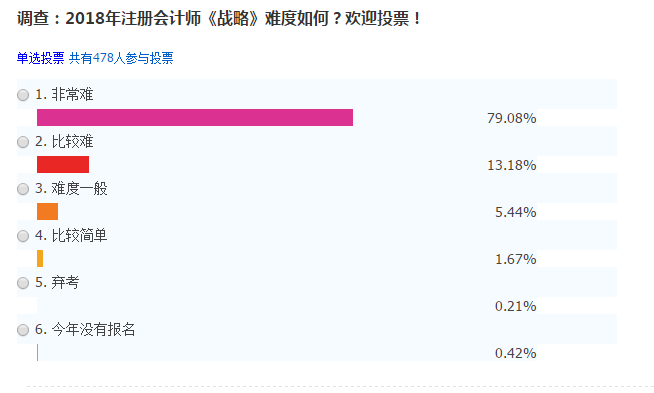 根据正保会计网校的调查问卷情况,近80%的考生认为今年的战略考试“非常难”!按照案例来说,战略本该是注会考试科目中最简单的一科。遥想小编当年,报了3科,只有战略堪堪过了及格线。