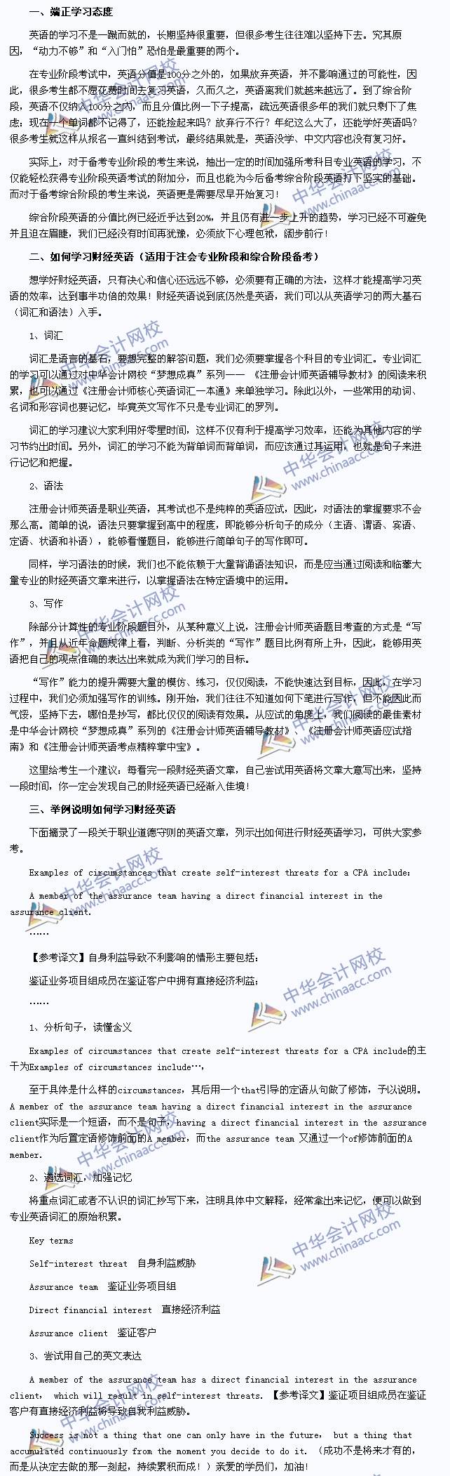 对于中国注册会计师考生来说,最不熟悉、比较有挑战性的恐怕就是注册会计师考试的英语部分,特别是综合阶段以英语出题和答题的部分,有一定难度。综合阶段的英语部分分数很多(一百分的22分),且必须用英语回答英语题目,所以正保会计网校注会考前辅导专家建议各位考生尽最大努力把这些分数拿下,务必认真学习英语。以下是对英语学习的建议。