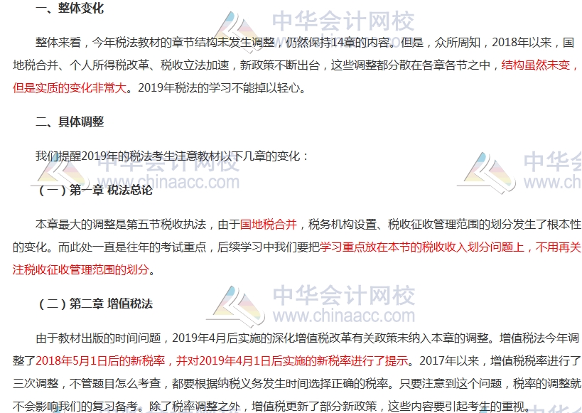 虽然2019年税法考试大纲提出“考试涉及的相关法规截至2018年12月31日”,但从教材来看,很多2019年后出台的新政策也纳入了今年的教材之中。不管怎么说,教材已经出版,下面我们就来一起看一下,2019年税法教材都进行了哪些调整: