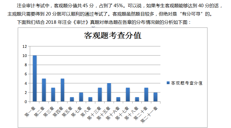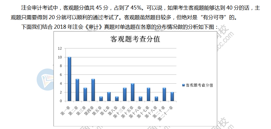 注会审计考试中,客观题分值共45分,占到了45%。可以说,如果考生客观题能够达到40分的话,主观题只需要得到20分就可以顺利的备考了。客观题虽然题目较多,但绝对是“有分可寻”的。
