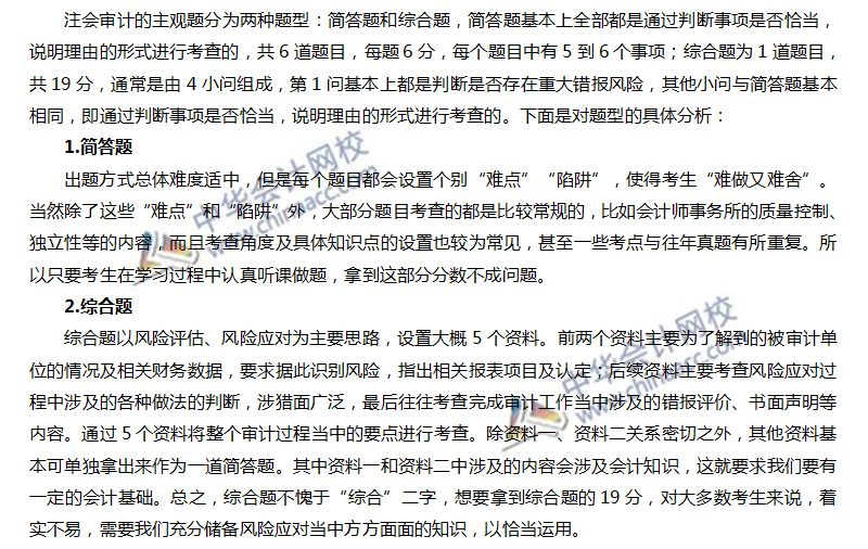 出题方式总体难度适中,但是每个题目都会设置个别“难点”“陷阱”,使得考生“难做又难舍”。当然除了这些“难点”和“陷阱”外,大部分题目考查的都是比较常规的,比如会计师事务所的质量控制、独立性等的内容,而且考查角度及具体知识点的设置也较为常见,甚至一些考点与往年试题有所重复。所以只要考生在学习过程中认真听课做题,拿到这部分分数不成问题。