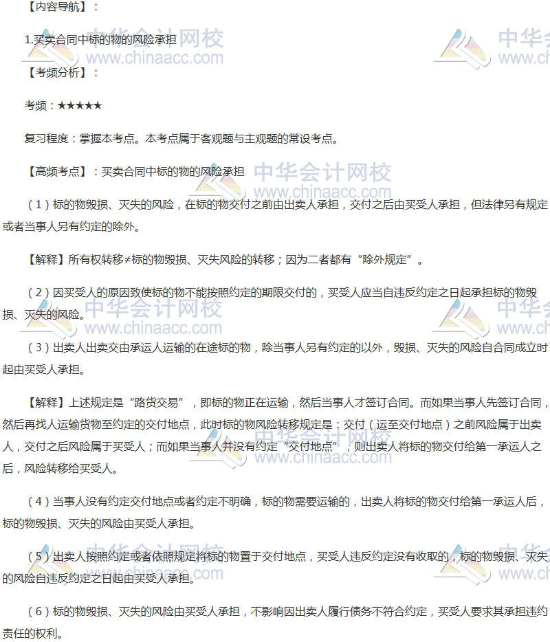 备考时间紧张,抓紧时间抓住重点备考注册会计师吧!正保会计网校教学老师为广大考生整理了高频考点,我们一起来学习2018《经济法》高频考点:买卖合同中标的物的风险承担。本考点属于《经济法》第四章合同法律制度第九节几类主要的有名合同的内容。