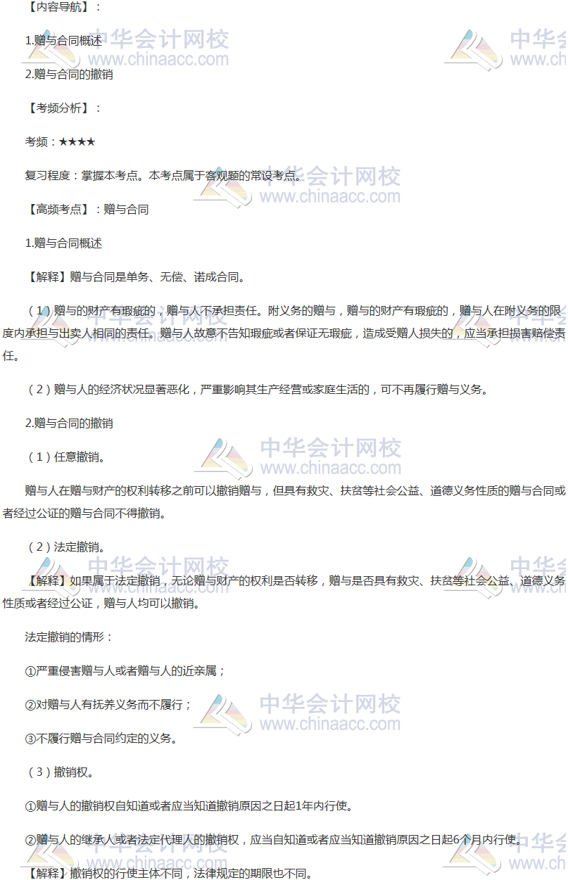 备考时间紧张,抓紧时间抓住重点备考注册会计师吧!正保会计网校教学老师为广大考生整理了高频考点,我们一起来学习2018《经济法》高频考点:赠与合同。本考点属于《经济法》第四章合同法律制度第九节几类主要的有名合同的内容。