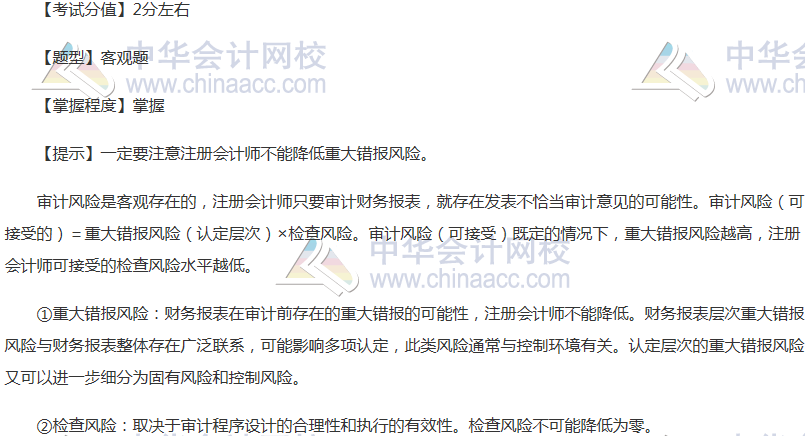 为了帮助2018年注册会计师考试的学员更好的复习备考,正保会计网校教学专家为大家整理了注册会计师《审计》稳拿20分系列知识点,希望对广大考生有帮助。以下为CPA《审计》科目的稳拿20分知识点。 现在让我们来学习稳拿20分系列——知识点1:审计风险。