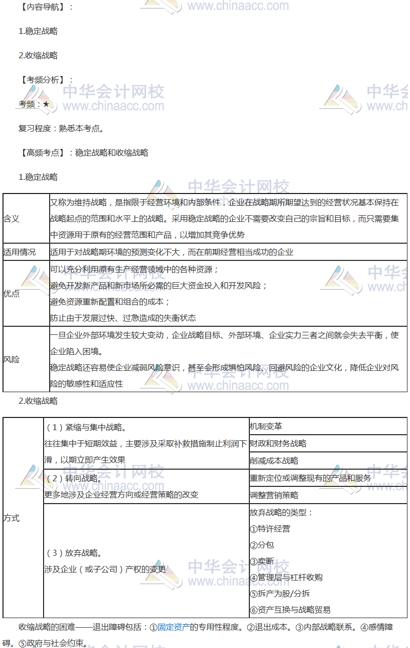 备考时间紧张,抓紧时间抓住重点备考注册会计师吧!正保会计网校教学老师为广大考生整理了高频考点,我们一起来学习2018《公司战略与风险管理》高频考点:稳定战略和收缩战略。本考点属于《公司战略与风险管理》第三章战略选择第一节总体战略(公司层战略)的内容。