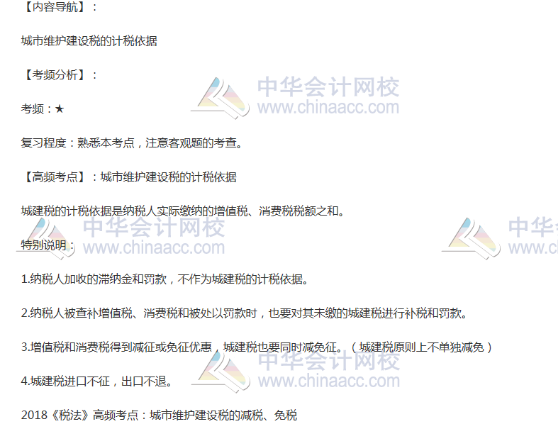备考时间紧张,抓紧时间抓住重点备考注册会计师吧!正保会计网校教学老师为广大考生整理了高频考点,我们一起来学习2018年《税法》高频考点:城市维护建设税的计税依据。本考点属于《税法》第六章城市维护建设税法和烟叶税法第一节城市维护建设税法的内容。