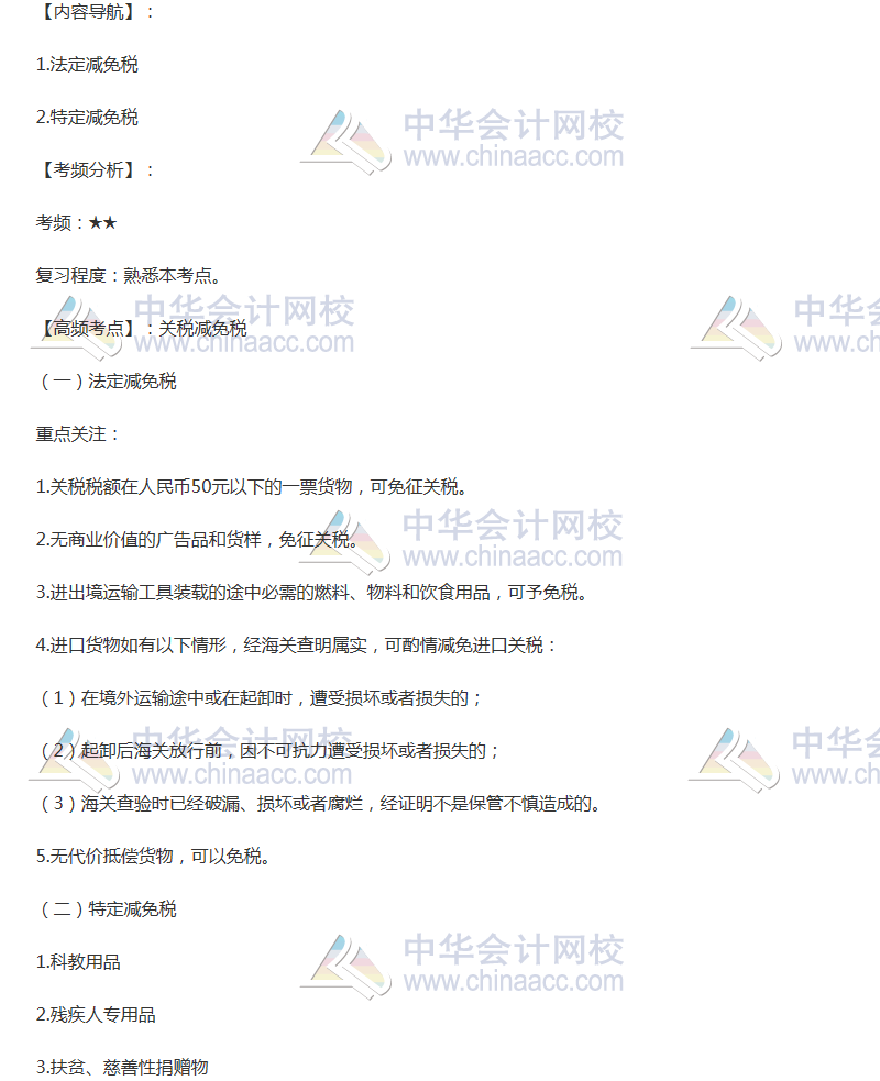备考时间紧张,抓紧时间抓住重点备考注册会计师吧!正保会计网校教学老师为广大考生整理了高频考点,我们一起来学习2018年《税法》高频考点:关税减免税。本考点属于《税法》第七章关税法第四节关税减免规定的内容。