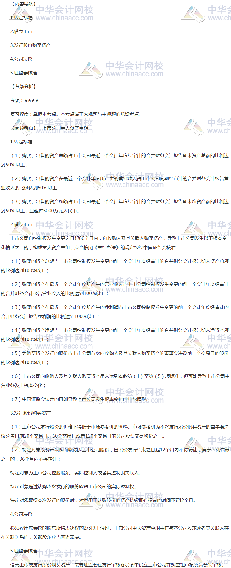 备考时间紧张,抓紧时间抓住重点备考注册会计师吧!正保会计网校教学老师为广大考生整理了高频考点,我们一起来学习2018《经济法》高频考点:上市公司重大资产重组。本考点属于《经济法》第七章证券法律制度第五节上市公司收购和重组的内容。