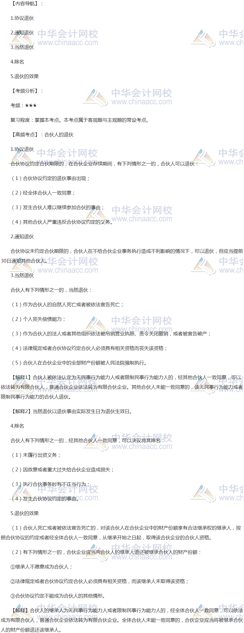 备考时间紧张,抓紧时间抓住重点备考注册会计师吧!正保会计网校教学老师为广大考生整理了高频考点,我们一起来学习2018《经济法》高频考点:合伙人的退伙。本考点属于《经济法》第五章合伙企业法律制度第二节普通合伙企业的内容。