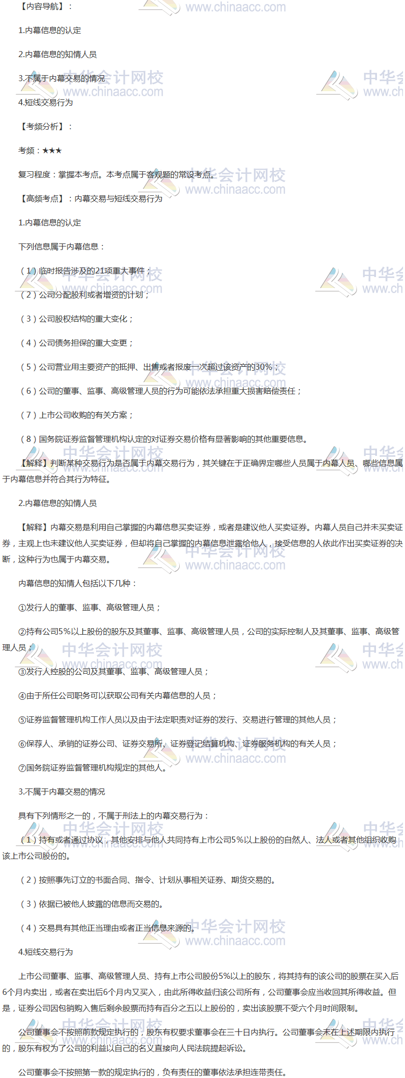 备考时间紧张,抓紧时间抓住重点备考注册会计师吧!正保会计网校教学老师为广大考生整理了高频考点,我们一起来学习2018《经济法》高频考点:内幕交易与短线交易行为。本考点属于《经济法》第七章证券法律制度第六节证券欺诈的法律责任的内容。