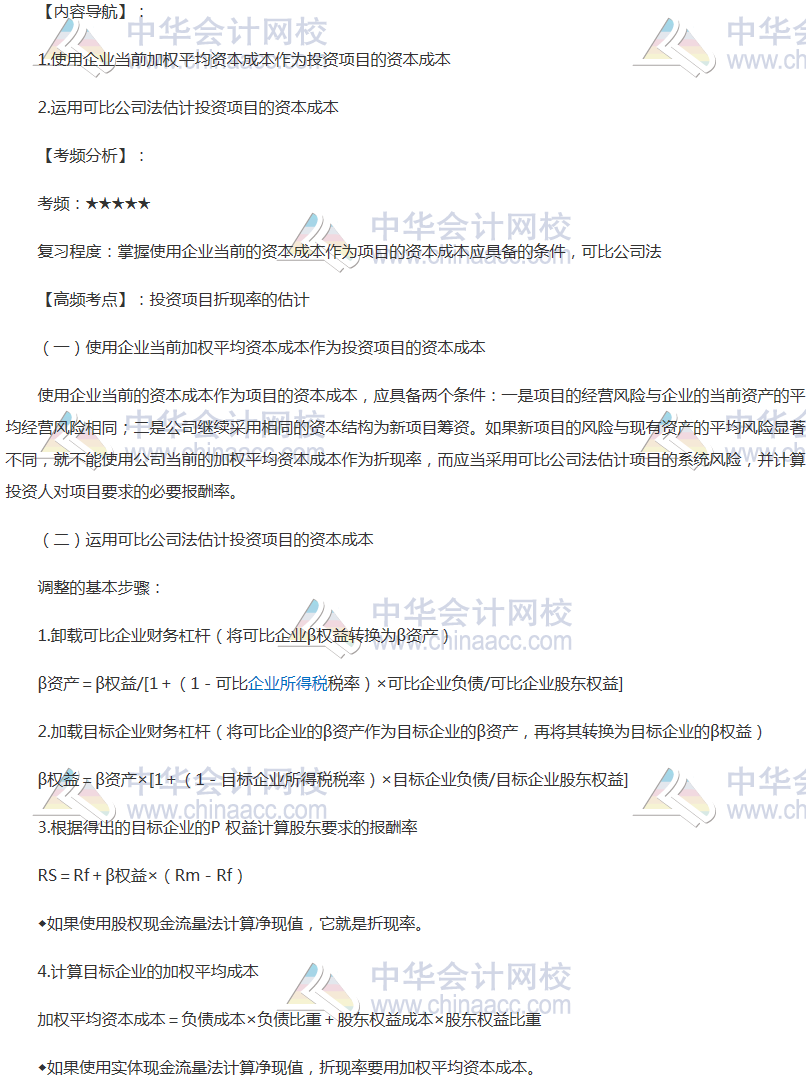 备考时间紧张,抓紧时间抓住重点备考注册会计师吧!正保会计网校教学老师为广大考生整理了高频考点,我们一起来学习2018年《财务成本管理》高频考点:投资项目的折现率的估计。本考点属于《财务成本管理》第五章投资项目资本预算第四节投资项目折现率的估计的内容。