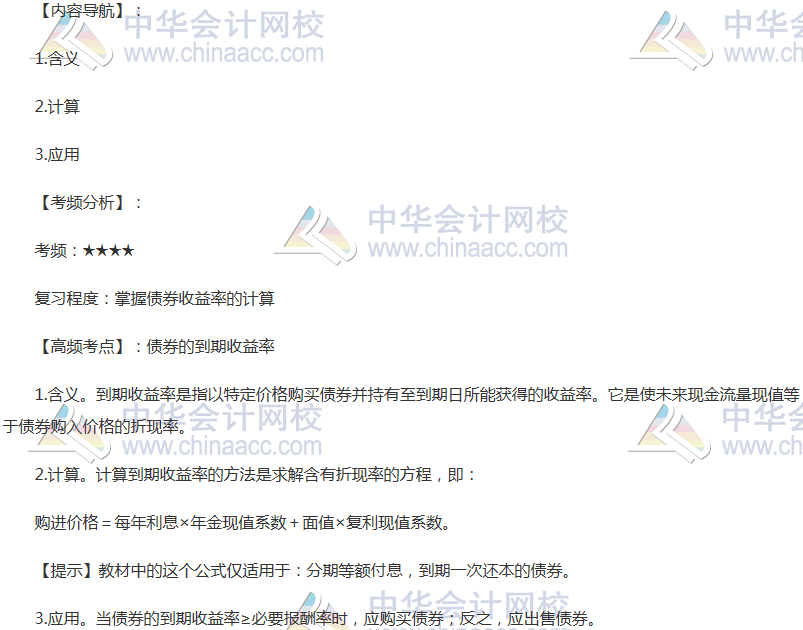 备考时间紧张,抓紧时间抓住重点备考注册会计师吧!正保会计网校教学老师为广大考生整理了高频考点, 我们一起来学习2018《财务成本管理》高频考点:债券的到期收益率。本考点属于《财务成本管理》第六章债券、股票价值评估第一节债券价值评估的内容。