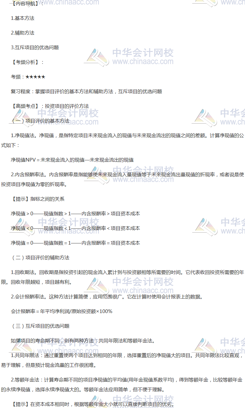 备考时间紧张,抓紧时间抓住重点备考注册会计师吧!正保会计网校教学老师为广大考生整理了高频考点, 我们一起来学习2018年《财务成本管理》高频考点:投资项目的评价方法。本考点属于《财务成本管理》第五章投资项目资本预算第二节投资项目的评价方法的内容。