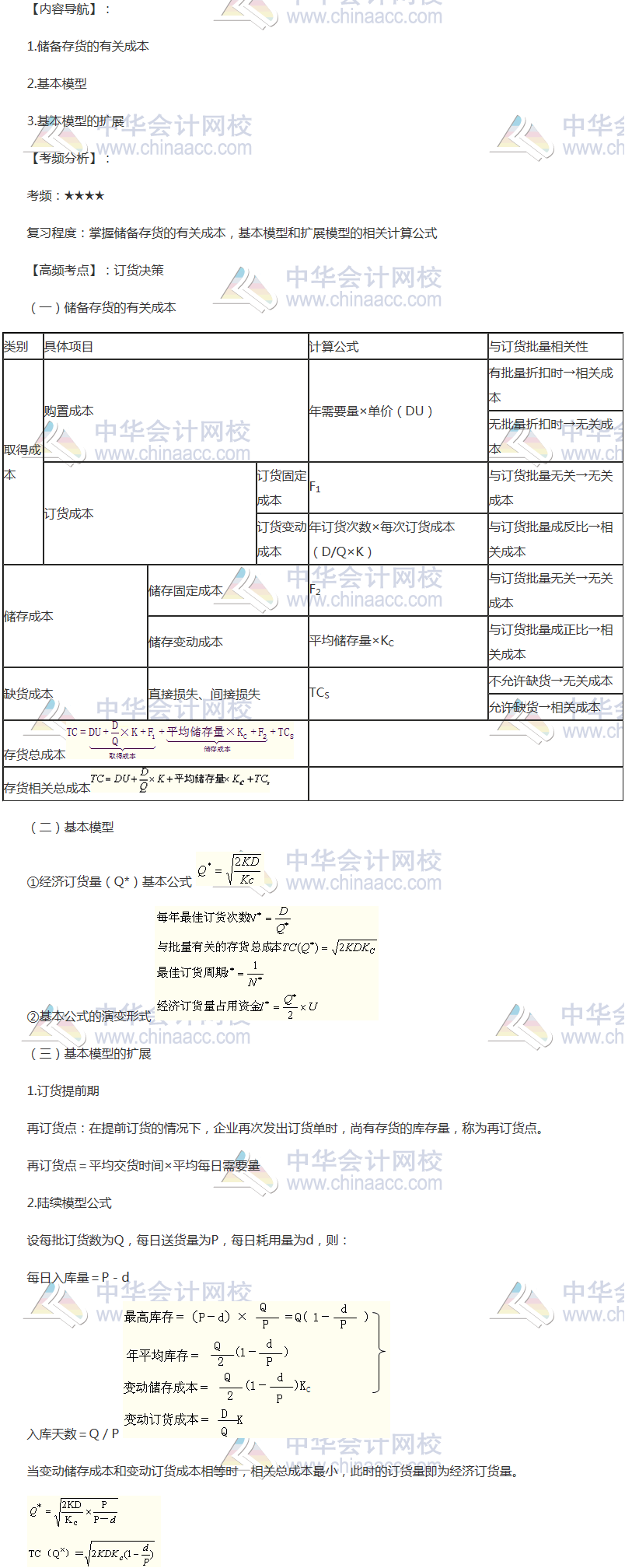 备考时间紧张,抓紧时间抓住重点备考注册会计师吧!正保会计网校教学老师为广大考生整理了高频考点, 我们一起来学习2018年《财务成本管理》高频考点:订货决策。本考点属于《财务成本管理》第十二章营运资本管理第四节存货管理的内容。